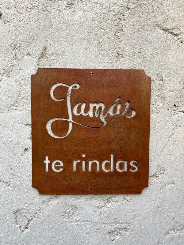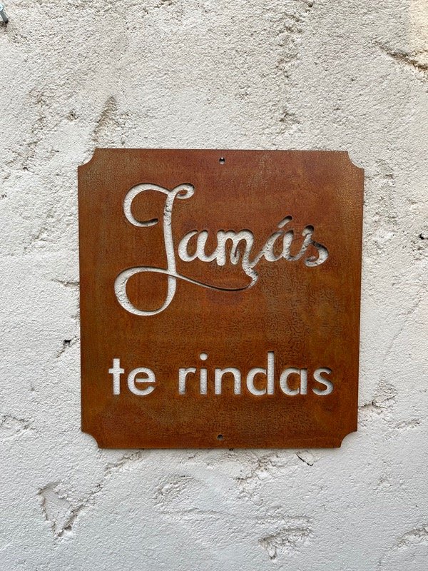 Chapa oxidada, laqueada, con inscripción Jamás te rindas.