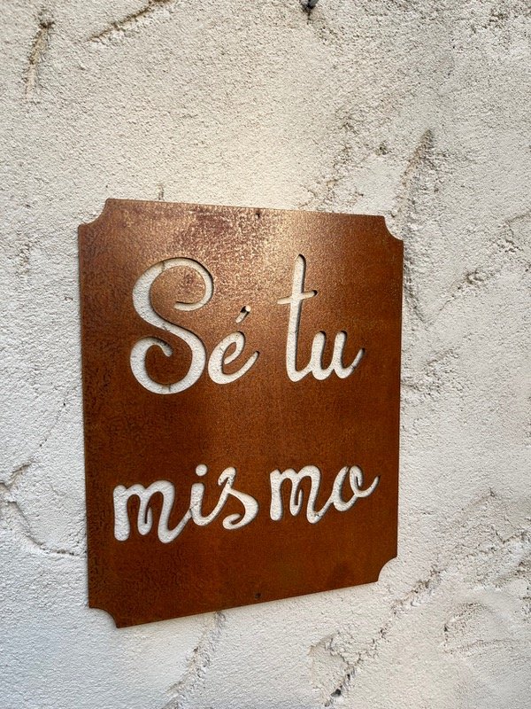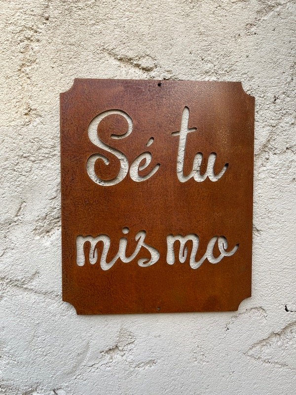 Chapa oxidada, laqueada, con inscripción Sé tu mismo.